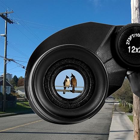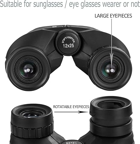 - 【HIGH-POWERED LARGE EYEPIECE BINOCULARS】 This binoculars for adults has 12x magnification, 25mm objective lens and wide field of view, 273ft/1000yds, letting you look farther and see wider. Coating with FMC Broadband coating and premium BAK4 prism, it ensure imaging verisimilar.